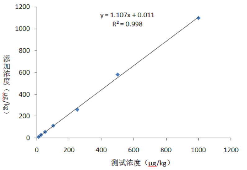 計(jì)算得出小麥的線性范圍:10.00~1000.00μg/kg(7點(diǎn)), 回歸方程: y = 1.107x + 0.011,相關(guān)系數(shù),R2 = 0.998;(見圖1)。