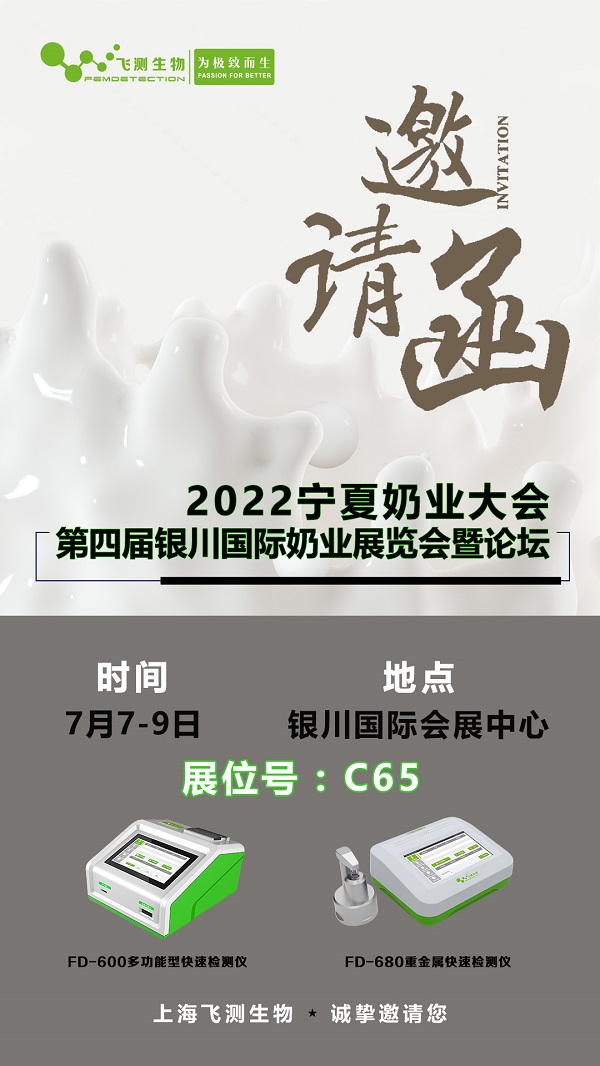 2022寧夏奶業(yè)大會暨第四屆中國(銀川)國際奶業(yè)展覽會暨論壇”將于7月7日-9日在寧夏銀川~銀川國際會展中心召開,2022寧夏奶業(yè)大會將繼續(xù)秉承助力寧夏和西北地區(qū)的奶業(yè)振興發(fā)展、以學(xué)術(shù)交流帶動展覽、以展覽促進(jìn)學(xué)術(shù)交流的辦展宗旨。致力于為政府、用戶、企業(yè)搭建溝通的橋梁和推廣新產(chǎn)品新技術(shù)貿(mào)易平臺。屆時,上海飛測生物在C65號展位,期待您的光臨。
